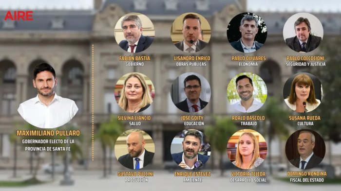 De esta manera, la nómina de colaboradores más estrechos del futuro gobernador quedó conformada de la siguiente manera, y eso es lo que se anunciará este martes en Cayastá: Fabián Bastía (Gobierno), Lisandro Enrico (Obras Públicas), Pablo Cococcioni (Seguridad y Justicia), Pablo Olivares (Economía), Silvia Ciancio (Salud), José Goity (Educación), Gustavo Puccini (Producción, Ciencia y Tecnología), Roald Báscolo (Trabajo, Empleo y Seguridad Social), Enrique Estévez (Ambiente y Cambio Climático), María Victoria Tejeda (Desarrollo Social), Susana Rueda (Cultura), Domingo Rondina (Fiscal de Estado, requiere acuerdo de la Asamblea Legislativa)