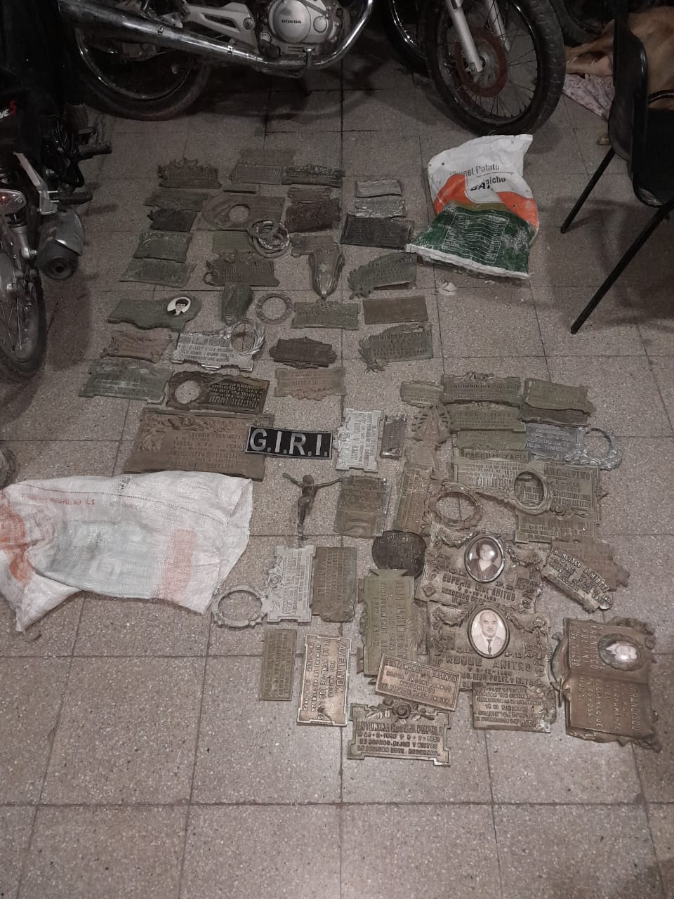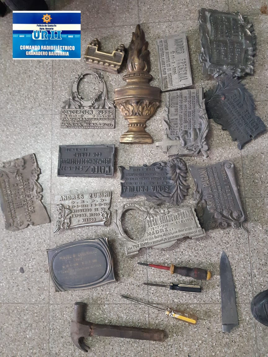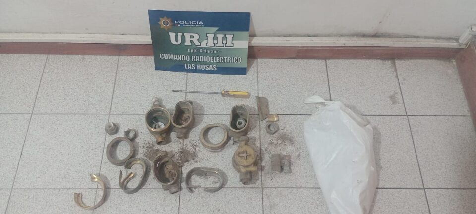 Robo de bronceDurante la jornada de ayer, policías de Rosario y de Las Rosassecuestraron más de 100 elementos de bronce, entre estos, placas ycrucifijos del cementerio y medidores de agua. En todos los casos, losagentes aprehendieron a quienes los sustrajeron y los trasladaron a lasdependencias policiales correspondientes.En la ciudad de RosarioRECUPERO DE MÁS DE 100 PICAPORTES Y PLACAS DE CEMENTERIO DE BRONCEROBADOSEn Rouillon y Gaboto secuestraron 13 trece placas de bronce delcementerio a un hombre que se trasladaba en bicicleta por la zona.En Sarmiento e Ituzaingó incautaron 13 piezas de picaportes de bronce,dos de aluminio de fundición y un corta hierro. Los agentes concretaronel procedimiento por un aviso al 911, en el que alertaban la presenciade un hombre robando picaportes, al que aprehendieron y trasladaron a ladependencia policial.En José Hernández al 800, los uniformados aprehendieron a un individuode 32 años que transportaba en un bolso con 16 piezas de picaportes ycuatro arandelas de los mismos.En Gálvez y Garzón, agentes que patrullaban la zona controlaron a tressujetos que trasladaban varias bolsas. De esta forma, secuestraron 61placas y un crucifijo todos de bronce.En Orsetti y Callao, los policías incautaron 10 placas de nichos yadornos fúnebres de bronce, tres destornilladores y una hoja decuchillo.En Las Rosas, Departamento BelgranoAPREHENDIDO Y SECUESTRO DE MEDIDORES DE AGUA DE LA MUNICIPALIDADEfectivos policiales fueron comisionados a calles Tres Lagunas y BuenosAires, debido a un desorden entre varias personas. Una vez en el sitio,los agentes tomaron conocimiento que un hombre que se alejó rápidamentehabría ingresado a una casa con aparentes fines delictivos. Por estemotivo, fueron tras el individuo y al interceptarlo le secuestraronpartes de medidores de agua pertenecientes a la municipalidad, los quefueron denunciados como robados días atrás. Una vez finalizado elprocedimiento, trasladaron las actuaciones a la Comisaría 1ra.