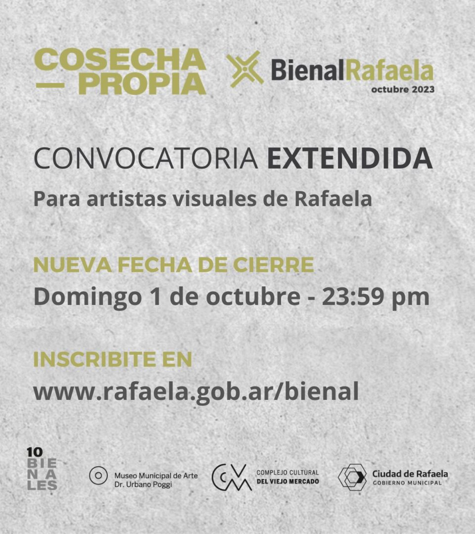 El Museo Municipal de Arte “Dr. Urbano Poggi” que depende de la Secretaría de Cultura de la Municipalidad de Rafaela, informa que se extiende la convocatoria para participar de la Bienal “Premio Ciudad de Rafaela”. El formulario de inscripción estará disponible hasta el domingo 1 de octubre a las 23:59 en www.rafaela.gob.ar/bienal.
